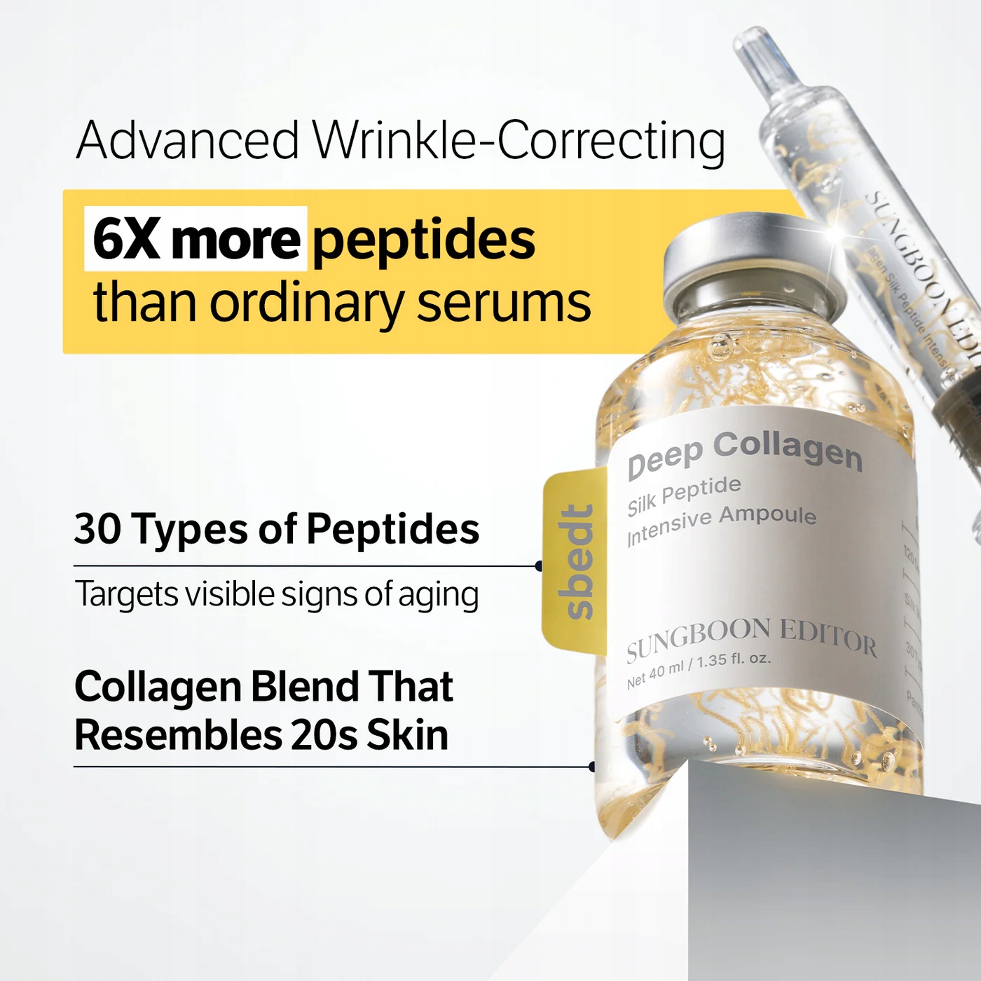 Odkryj efekt liftingu w domowym zastosowaniu dzięki Deep Collagen Silk Peptide Ampoule od SUNGBOON EDITOR. Serum natychmiast wygładza drobne zmarszczki i intensywnie ujędrnia skórę dzięki innowacyjnym niciom z peptydów jedwabiu, które zapewniają widoczne i długotrwałe rezultaty.